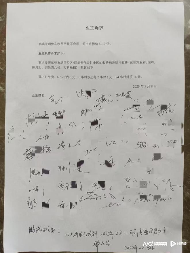 当天现场,鹏瑞天玥业主们对于停车费提出了诉求并集体签名,希望按照东莞市场同片区/同类型代表性小区的收费标准进行收费(东莞万象府、润府臻湾汇、御景湾八号、万科松樾),具体如下:首小时免费、6小时内5元、6小时以上每2小时1元,24小时封顶14元。“同类型小区收费标准月租是400元左右。”李先生如是说。