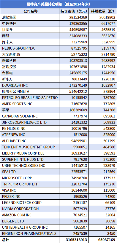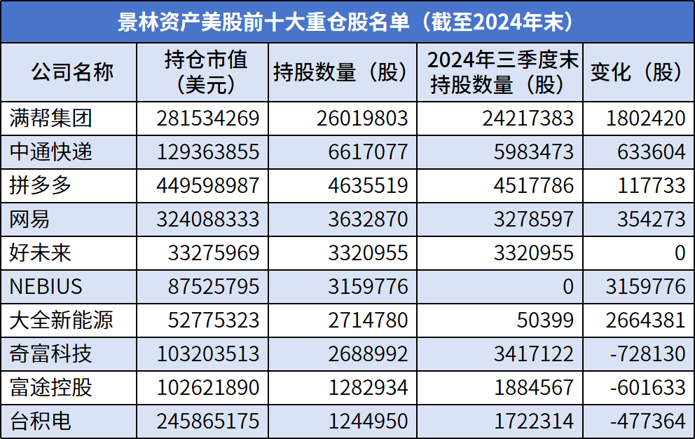 美国证券交易委员会公开资料显示,截至2024年末,景林资产美股持仓的前十大重仓股分别为满帮集团、中通快递、拼多多、网易、好未来、NEBIUS、大全新能源、奇富科技、富途控股和台积电。