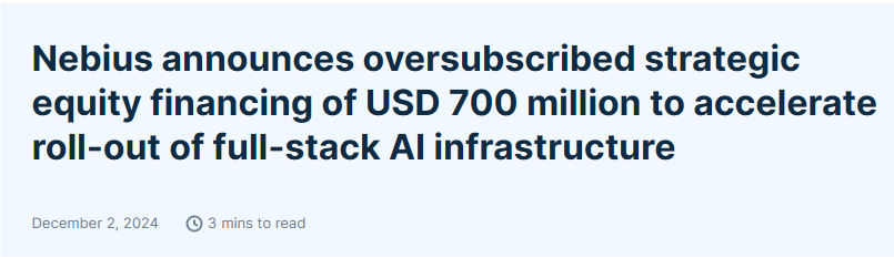 公开资料显示,NEBIUS专注于为全球人工智能先驱构建全栈人工智能基础设施,公司提供大规模GPU集群、云平台以及面向开发人员的工具和服务,致力于推动人工智能技术的发展和应用。2024年12月,NEBIUS宣布获得了Accel、Orbis Investment及英伟达的战略投资,此次投资将助力NEBIUS进一步构建全栈人工智能基础设施。