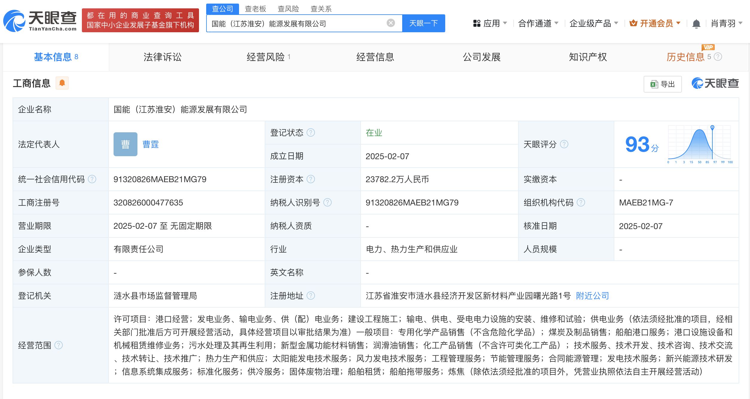天眼查App显示,近日,国能(江苏淮安)能源发展有限公司成立,法定代表人为曹霆,注册资本约2.4亿人民币,经营范围包括热力生产和供应、太阳能发电技术服务、风力发电技术服务、工程管理服务、节能管理服务、合同能源管理、发电技术服务、新兴能源技术研发等。股东信息显示,该公司由国家能源集团江苏电力有限公司、江苏安东控股集团有限公司共同持股。