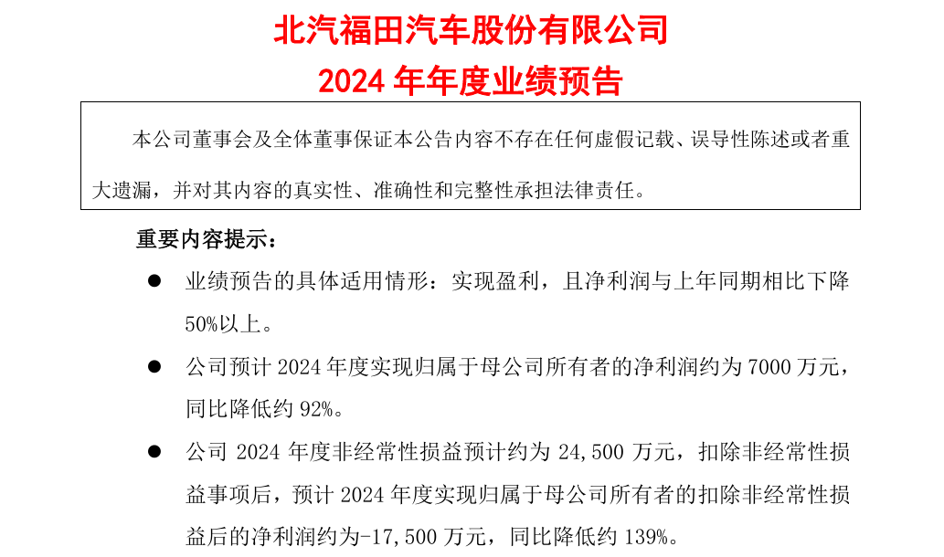1月24日,福田汽车公告,公司预计2024年度主营业务利润约为-1.7亿元,同比减少约6.2亿元;归母净利润约7000万元,同比下降约92%;扣非净利润约-1.75亿元,同比下降约139%。