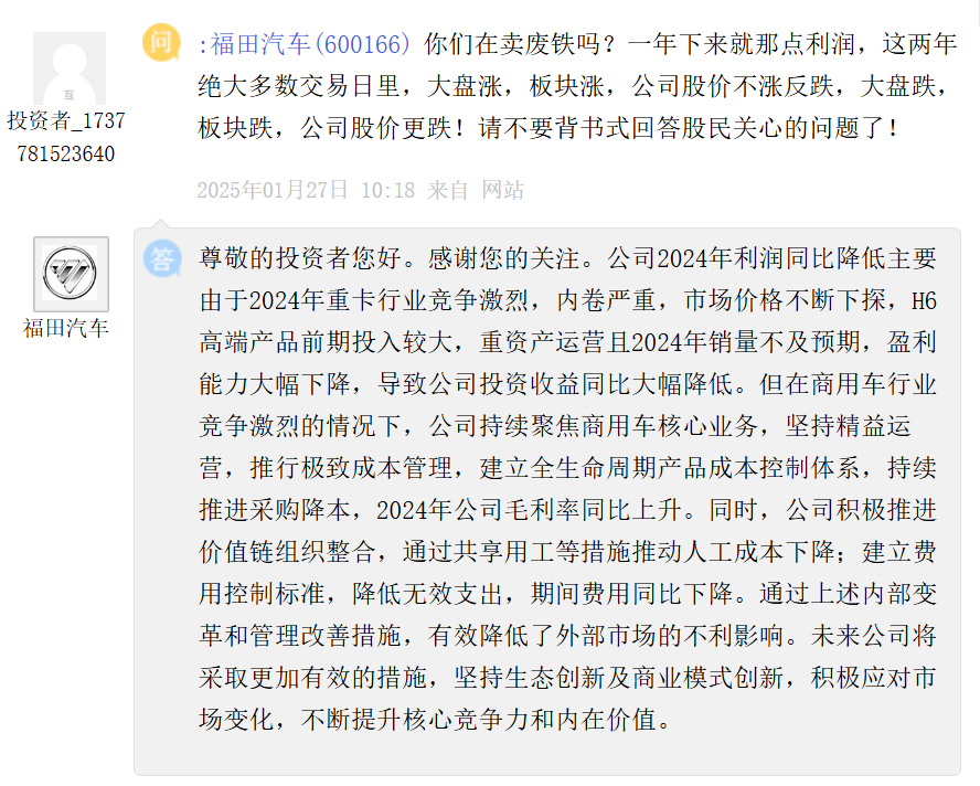 不过,针对股价表现,福田汽车并未给出直接解释与应对措施。