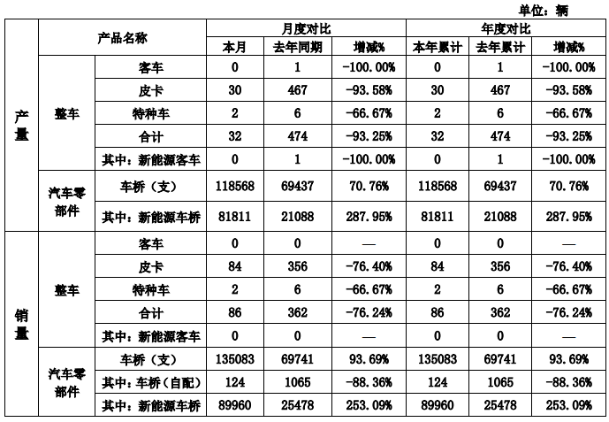 ST曙光2月7日公告,2025年1月整车销量为86辆,同比下降76.24%。其中,皮卡销量为84辆,同比下降76.40%;特种车销量为2辆,同比下降66.67%。