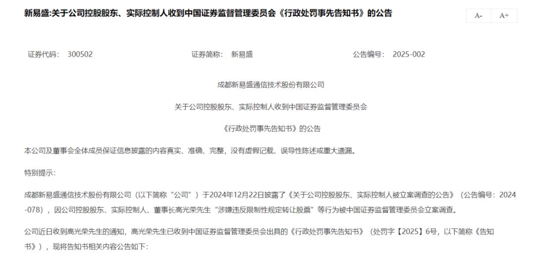 春节前,新易盛发布公告称,公司收到公司控股股东、实际控制人、董事长高光荣的通知,高光荣已收到中国证券监督管理委员会出具的《行政处罚事先告知书》(以下简称“《告知书》”)。