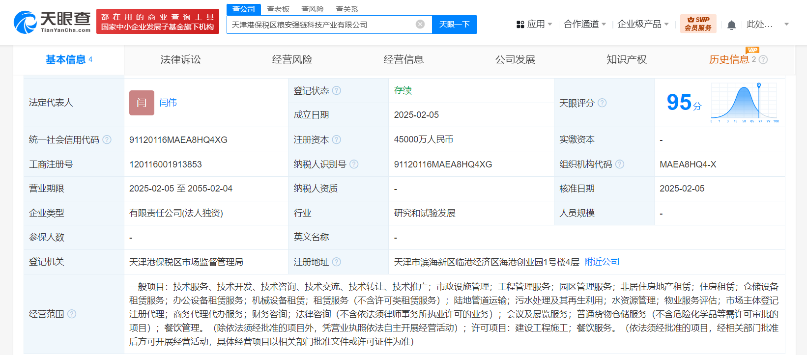天眼查App显示,近日,天津港保税区粮安强链科技产业有限公司成立,法定代表人为闫伟,注册资本4.5亿人民币,经营范围含市政设施管理、工程管理服务、非居住房地产租赁、住房租赁、租赁服务、水资源管理、商务代理代办服务、财务咨询、普通货物仓储服务等。股东信息显示,该公司由天津临港新动能经济开发有限公司全资持股。