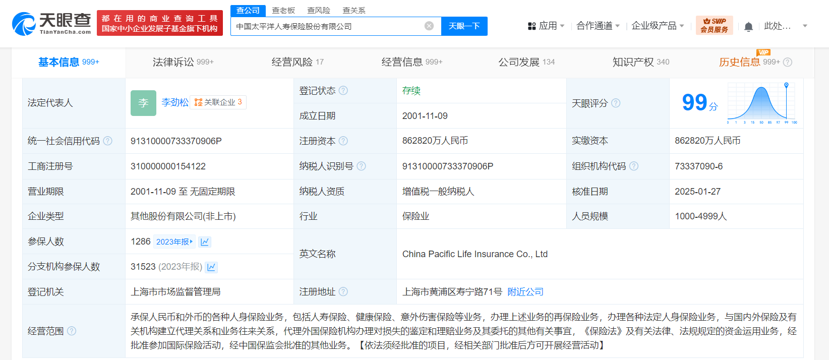 该公司成立于2001年11月,法定代表人为李劲松,注册资本约86.28亿人民币,经营范围含承保人民币和外币的各种人身保险业务,包括人寿保险、健康保险、意外伤害保险等业务,办理上述业务的再保险业务,办理各种法定人身保险业务等。股东信息显示,该公司由中国太保(601601)、申能(集团)有限公司、上海国有资产经营有限公司等共同持股。