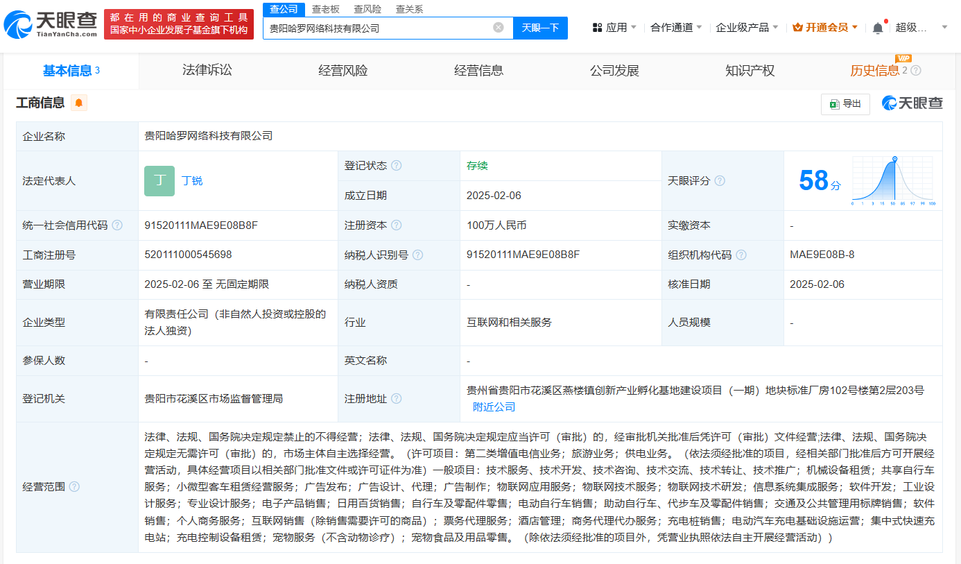 天眼查App显示,近日,贵阳哈罗网络科技有限公司成立,法定代表人为丁锐,注册资本100万人民币,经营范围包括旅游业务、小微型客车租赁经营服务、充电桩销售、电动汽车充电基础设施运营、集中式快速充电站等。股东信息显示,该公司由上海哈啰普惠科技有限公司全资持股。