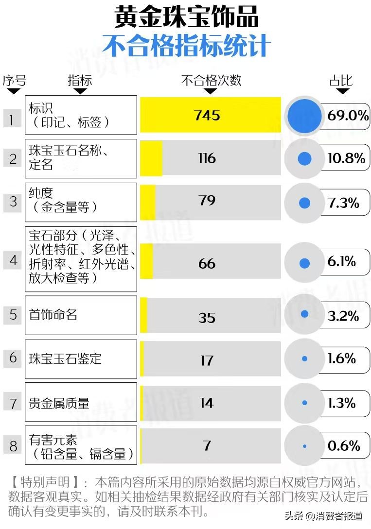 三、纯度,79批次不合格,占比7.3%。贵金属饰品中的贵金属含量直接决定了其价值高低,贵金属(如金、银、铂和钯等)的含量越高,价值也越大。纯度指的是贵金属元素的最低质量含量,以贵金属的质量含量千分数计量。