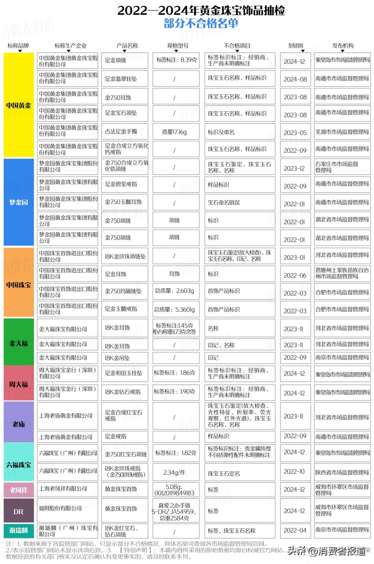 近期,《消费者报道》整理了国家市场监督管理总局及各省市区级市场监督管理局于近3年发布的黄金珠宝饰品抽检情况,供消费者参考。