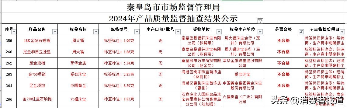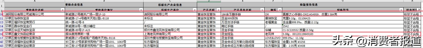 中国黄金、老庙、周大福、老凤祥、DR等被检出不合格