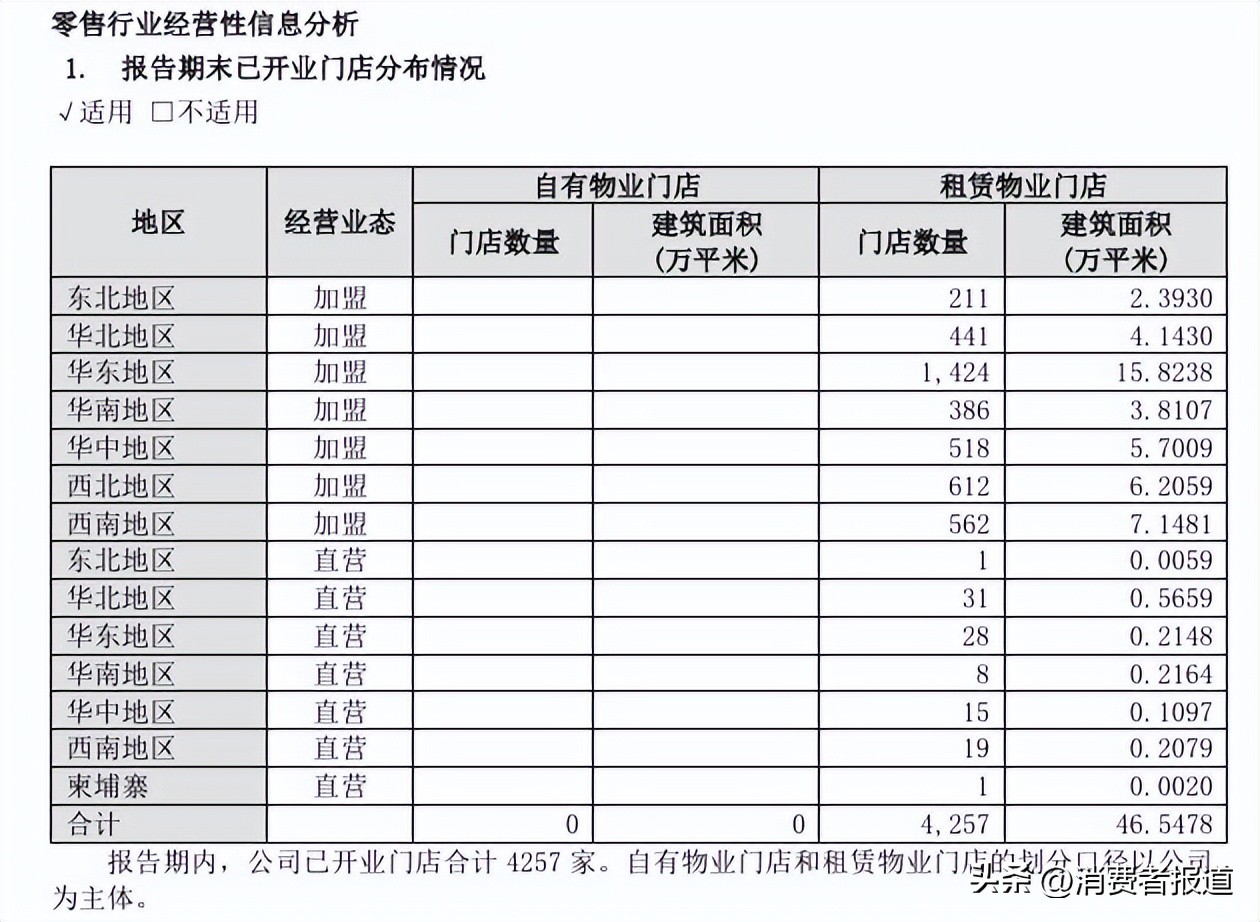 中国黄金(600916.SH)2023年年度报告显示,其销售模式主要包括直销模式和经销模式。直销模式主要包括直营店渠道、银行大客户渠道、电商渠道等,经销模式主要为加盟店渠道。截至2023年末,中国黄金已开业门店合计4257家。其中直营店共计103家,华北地区数量最多;加盟店共计4154家,占比高达97.58%,主要分布在华东地区。也就是说,消费者在市面上看到的“中国黄金”门店,超过九成均是加盟店。