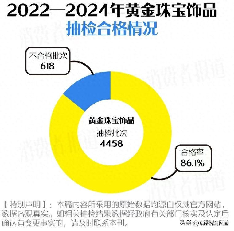 据《消费者报道》统计,过去三年(2022年1月—2024年12月),国家市场监督管理总局及各省市区级市场监督管理局共抽检黄金珠宝饰品4458批次,产品涉及项链、挂坠、手镯、戒指等,其中618批次不合格,整体合格率约为86.1%。