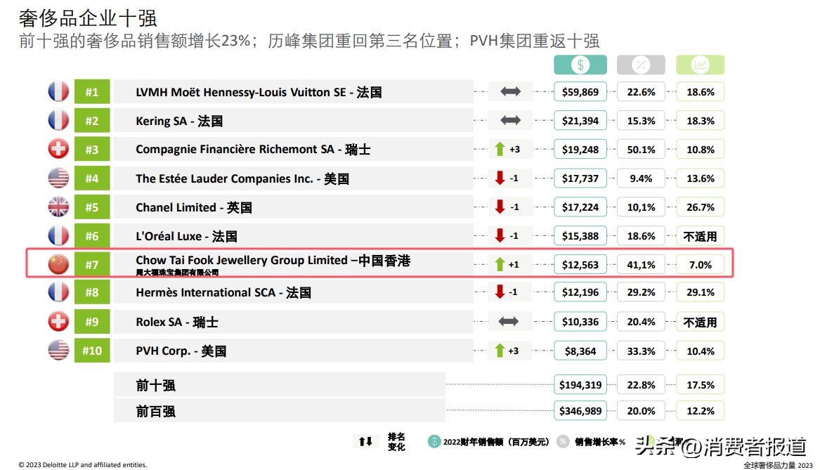 根据公开资料,“周大福”创立于1929年广州,创始人为周至元,主要经营传统黄金饰品。1960年,将“周大福”带到香港的周至元的女婿郑裕彤组建了周大福珠宝有限公司。根据德勤发布的《2023年全球奢侈品力量》,周大福是当前市值最高的中国奢侈品品牌,在全球奢侈品牌中排名第八,超过爱马仕和劳力士。
