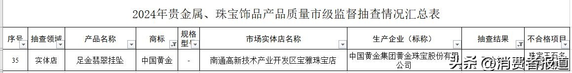2024年8月,南通市市场监督管理局发布2024年贵金属、珠宝饰品产品质量市级监督抽查情况的公告。公告显示,1批次标称由“中国黄金集团黄金珠宝股份有限公司”生产的标称商标为“中国黄金”的足金翡翠挂坠被检出不合格,不合格项目为珠宝玉石名称、样品标识。