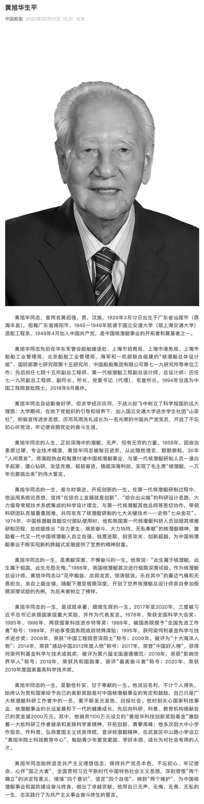 2月7日,黄旭华同志治丧工作委员会发布讣告,中国共产党优秀党员,中国工程院院士,共和国勋章、国家最高科学技术奖获得者,全国道德模范,中国第一代核潜艇工程总设计师,中国船舶集团有限公司第七一九研究所原所长、党委书记(代理)、名誉所长黄旭华同志,因病医治无效,于2025年2月6日20时30分在湖北武汉逝世,享年99岁。