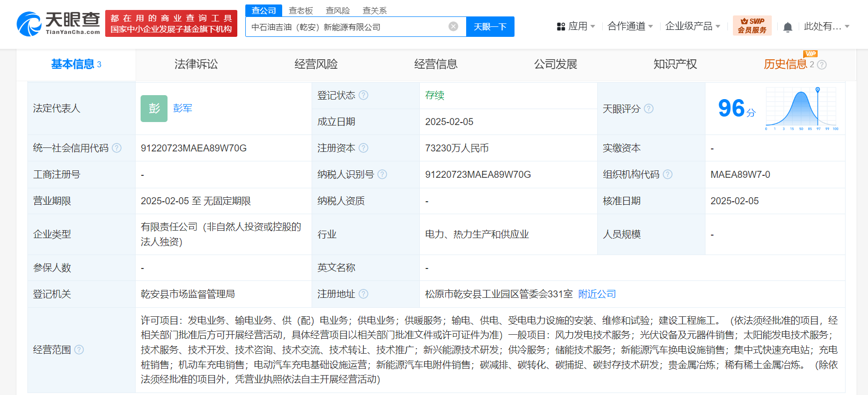 天眼查App显示,近日,中石油吉油(乾安)新能源有限公司成立,法定代表人为彭军,注册资本约7.3亿人民币,经营范围含发电业务、输电业务、供(配)电业务,风力发电技术服务,光伏设备及元器件销售,太阳能发电技术服务,新兴能源技术研发,新能源汽车换电设施销售,集中式快速充电站,充电桩销售,新能源汽车电附件销售等。股权全景穿透图显示,该公司由中石油太湖(北京)投资有限公司全资持股,后者为中国石油(601857)全资子公司。