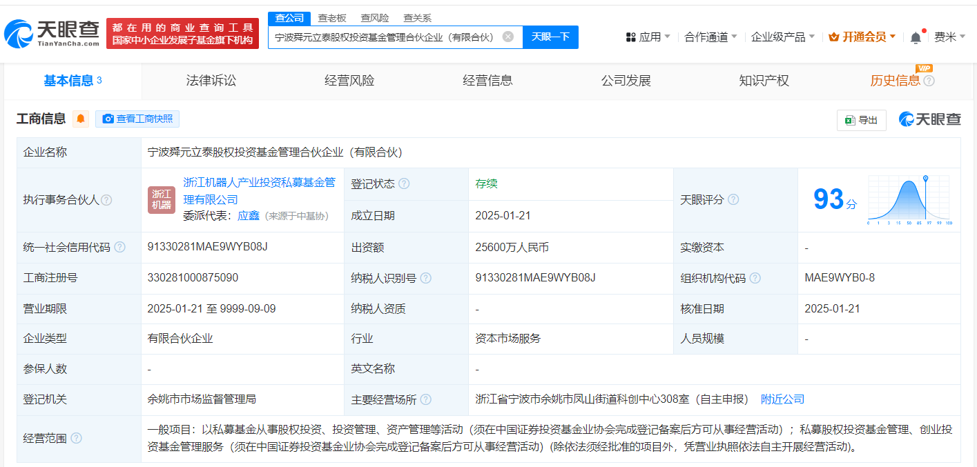天眼查App显示,近日,宁波舜元立泰股权投资基金管理合伙企业(有限合伙)成立,执行事务合伙人为浙江机器人产业投资私募基金管理有限公司,出资额2.56亿人民币,经营范围为以私募基金从事股权投资、投资管理、资产管理等活动,私募股权投资基金管理、创业投资基金管理服务,由浙江机器人产业集团有限公司及旗下浙江机器人产业投资私募基金管理有限公司共同出资。