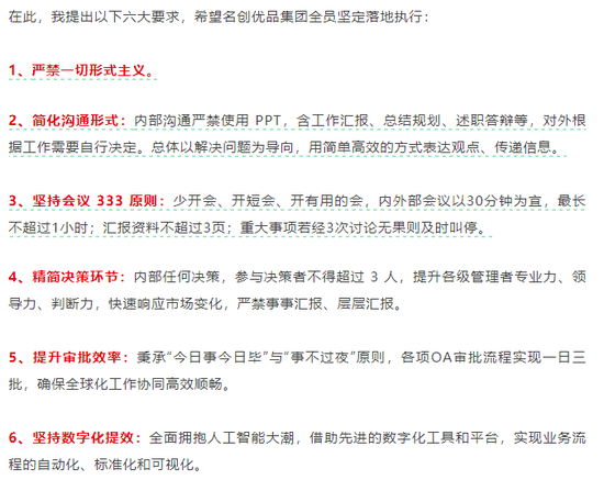 叶国富提出与组织管理相关的六大要求,以提升管理效率,达到战略聚焦的目的。文中所提及的具体要求包括:严禁一切形式主义;内部沟通严禁使用 PPT;内外部会议以30分钟为宜,最长不超过1小时;汇报资料不超过3页;内部任何决策,参与决策者不得超过3人等,这些都引发行业关注与热议。