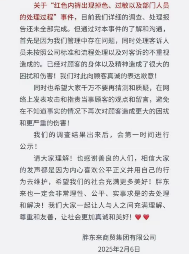 针对网友发视频称从胖东来购买的红色内裤出现掉色、过敏的情况,2月6日,胖东来商贸集团再度发文回应。胖东来表示,关于“红色内裤出现掉色、过敏以及部门人员的处理过程”事件,目前详细的调查、处理报告还未全部完成。但通过对本事件的了解和沟通,首先是因为管理中存在问题,同时处理客诉人员未按照公司标准和流程处理以及对客诉的不重视造成的。