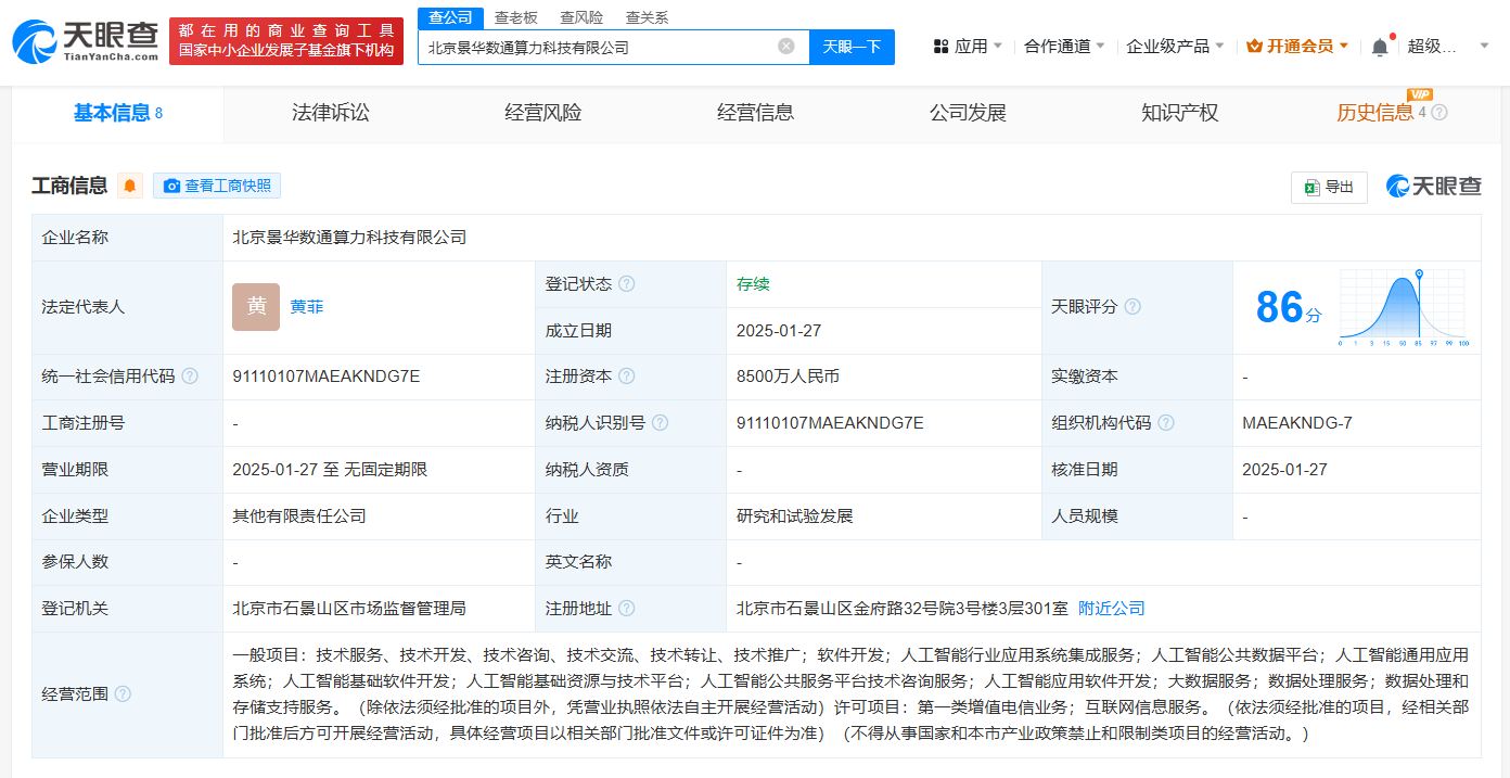 天眼查App显示,近日,北京景华数通算力科技有限公司成立,法定代表人为黄菲,注册资本8500万人民币,经营范围包括人工智能行业应用系统集成服务、人工智能公共数据平台、人工智能通用应用系统、人工智能基础软件开发、人工智能基础资源与技术平台等。股东信息显示,该公司由北京市石景山区国有资本投资有限公司及其旗下北京实兴集团有限公司共同持股。