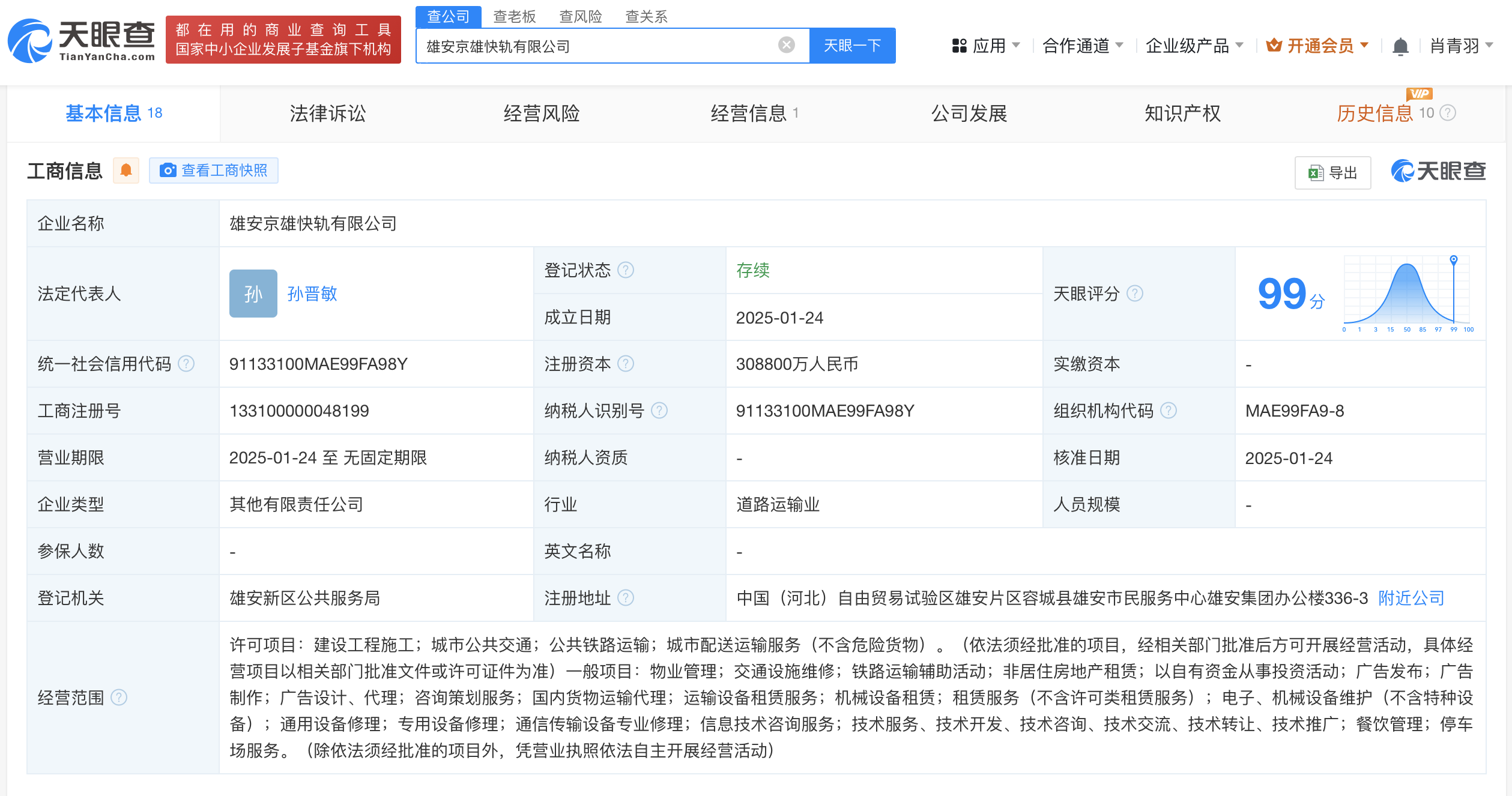 天眼查App显示,近日,雄安京雄快轨有限公司成立,法定代表人为孙晋敏,注册资本约30.88亿人民币,经营范围含建设工程施工、城市公共交通、公共铁路运输、城市配送运输服务等。股东信息显示,该公司由河北雄安轨道快线有限责任公司、中车智能交通工程技术有限公司、中铁三局集团有限公司、通号城市轨道交通技术有限公司、雄安雄商发展有限公司共同持股。