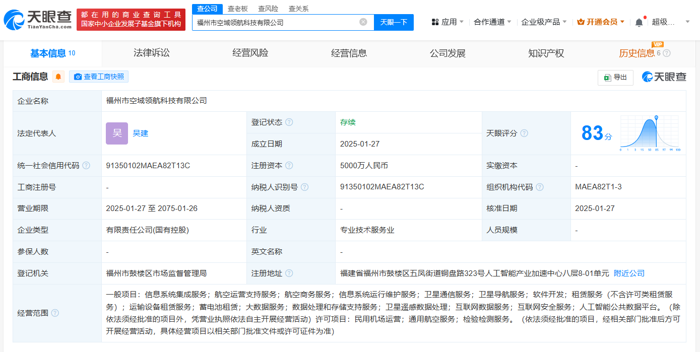 天眼查App显示,近日,福州市空域领航科技有限公司成立,法定代表人为吴建,注册资本5000万人民币,经营范围包括信息系统集成服务、航空运营支持服务、航空商务服务、大数据服务、数据处理和存储支持服务、卫星遥感数据处理等。股东信息显示,该公司由福州市勘测院有限公司和福州市鼓楼区城建投资发展集团有限公司分别持股65%、35%。
