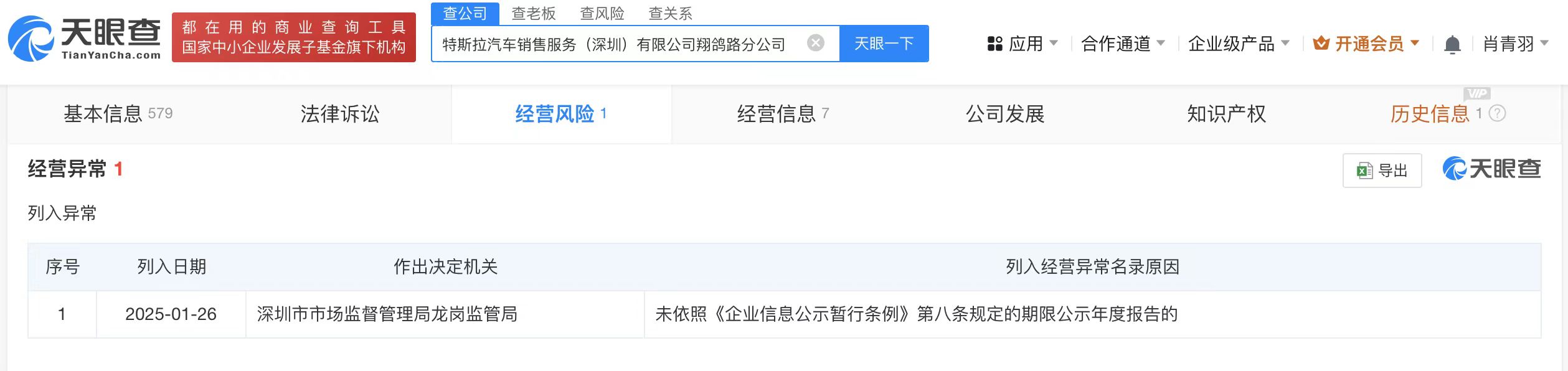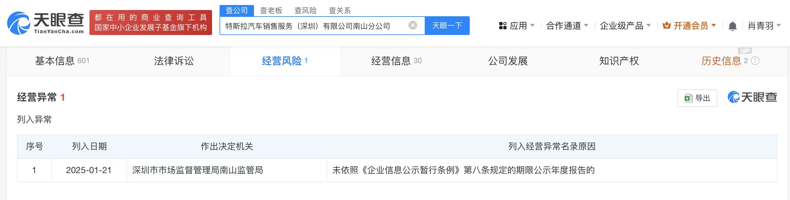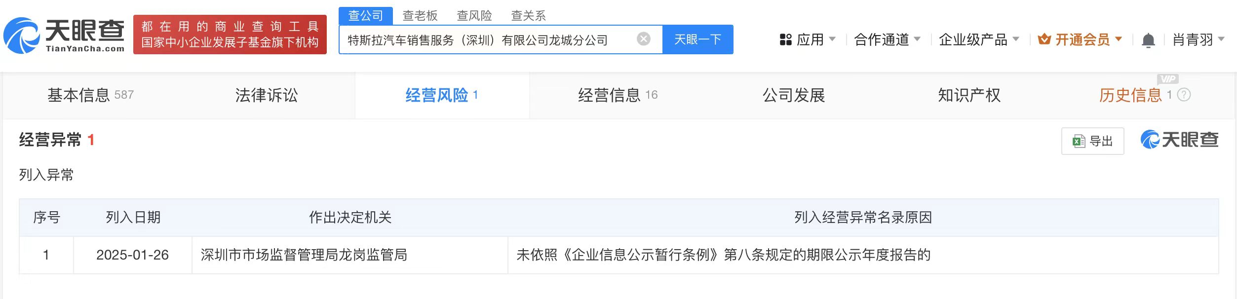 天眼查天眼风险显示,近日,特斯拉汽车销售服务(深圳)有限公司南山分公司、特斯拉汽车销售服务(深圳)有限公司翔鸽路分公司、特斯拉汽车销售服务(深圳)有限公司龙城分公司因未依照规定的期限公示年度报告,分别被深圳市市场监督管理局南山监管局、深圳市市场监督管理局龙岗监管局列入经营异常名录。