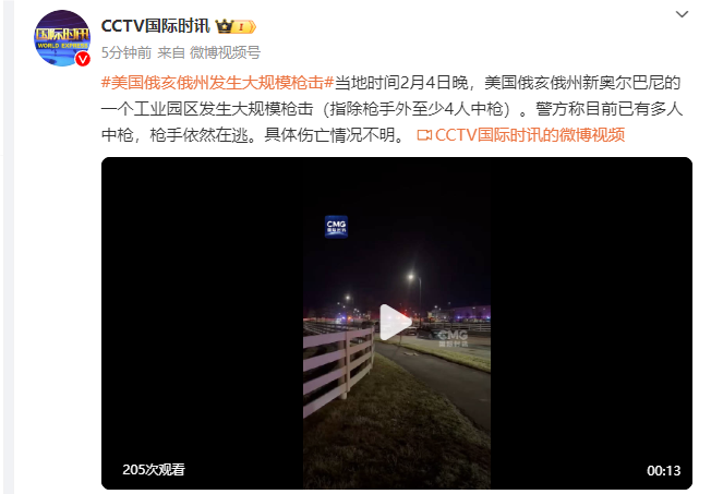 当地时间2月4日晚,美国俄亥俄州新奥尔巴尼的一个工业园区发生大规模枪击(指除枪手外至少4人中枪)。警方称目前已有多人中枪,枪手依然在逃。具体伤亡情况不明。