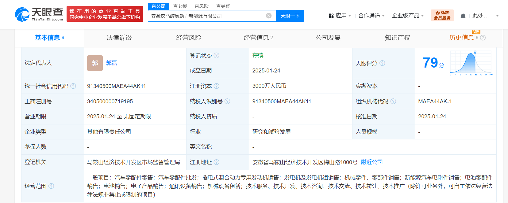 天眼查App显示,近日,安徽汉马醇氢动力新能源有限公司成立,法定代表人为郭磊,注册资本3000万人民币,经营范围含汽车零配件零售、汽车零配件批发、插电式混合动力专用发动机销售、发电机及发电机组销售、新能源汽车电附件销售、电子产品销售等。股东信息显示,该公司由*ST汉马(600375)、马鞍山醇氢企业管理合伙企业(有限合伙)共同持股。