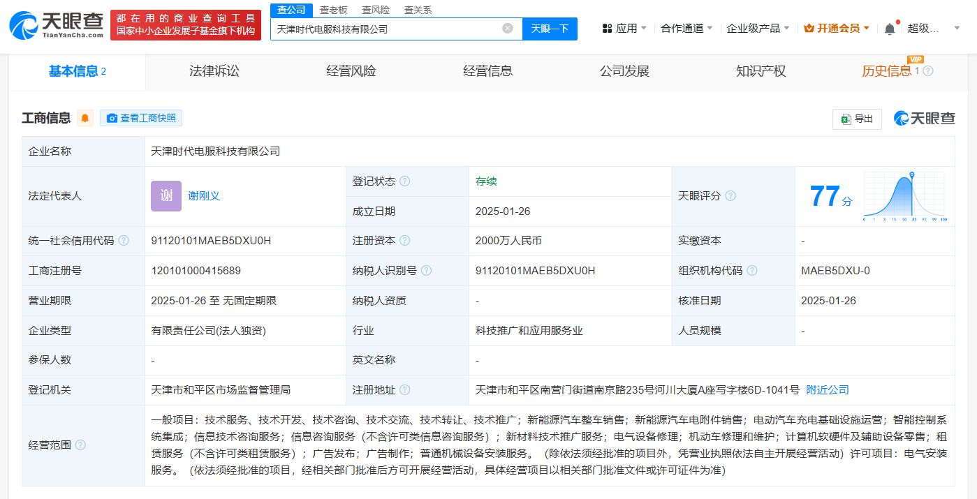 天眼查App显示,近日,天津时代电服科技有限公司、合肥时代电服科技有限公司、温州时代电服科技有限公司成立,注册资本分别为2000万元人民币、2000万元人民币、1000万元人民币,经营范围包括新能源汽车整车销售、新能源汽车电附件销售、电动汽车充电基础设施运营等。股东信息显示,上述公司均由宁德时代(300750)旗下时代电服科技有限公司全资持股。