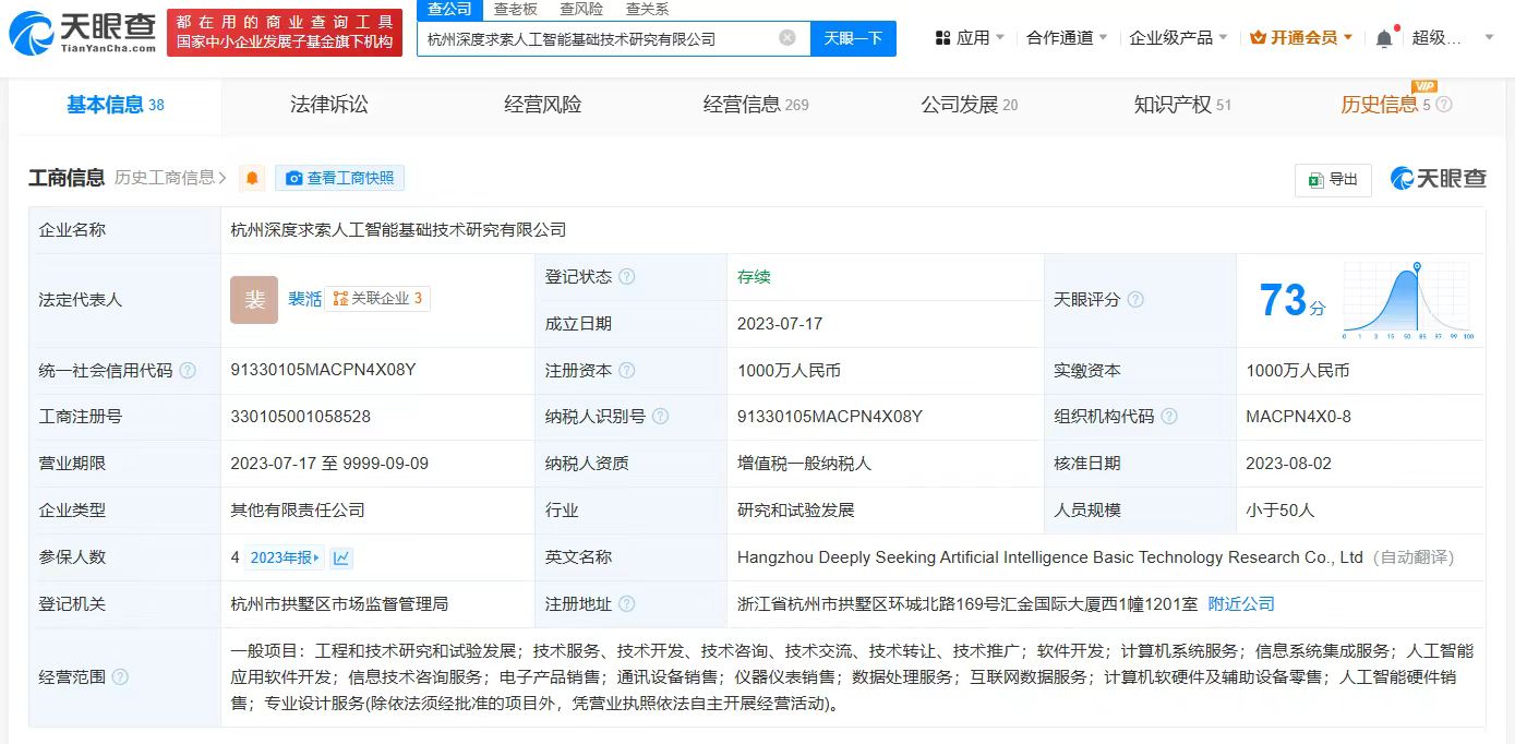 天眼查App显示,杭州深度求索人工智能基础技术研究有限公司成立于2023年7月,法定代表人为裴湉,注册资本1000万人民币,经营范围包括信息系统集成服务、人工智能应用软件开发、信息技术咨询服务等,由梁文锋及其名下宁波程恩企业管理咨询合伙企业(有限合伙)共同持股。知识产权信息显示,该公司已成功注册多枚“DEEPSEEK”“求索对话”“深度求索”商标,国际分类涉及广告销售、科学仪器、教育娱乐等。此外,该公司全资持股的北京深度求索人工智能基础技术研究有限公司,已于2024年12月获批登记“Deepseek对话软件系统”软件著作权,版本号为V1.0。