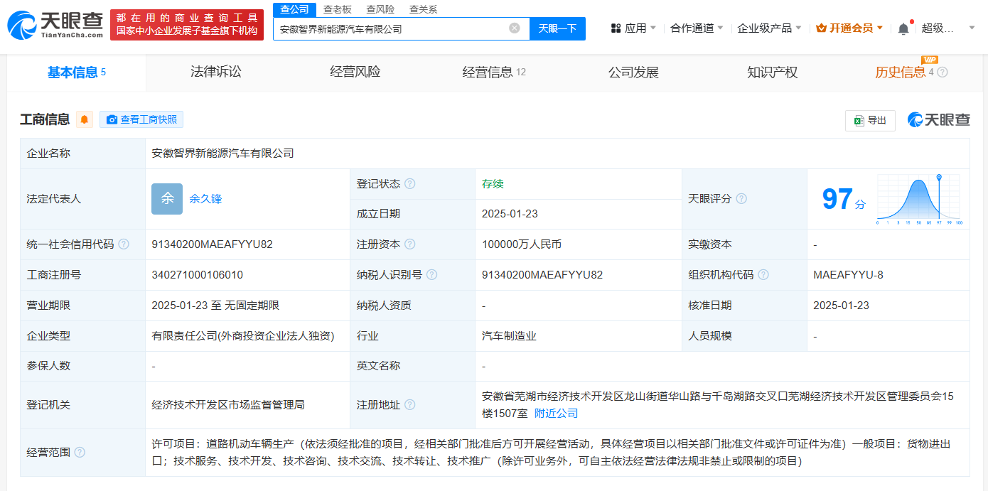 天眼查App显示,近期,安徽智界新能源汽车有限公司成立,法定代表人为余久锋,注册资本10亿人民币,经营范围包括道路机动车辆生产、货物进出口等。股东信息显示,该公司由奇瑞汽车股份有限公司全资持股。