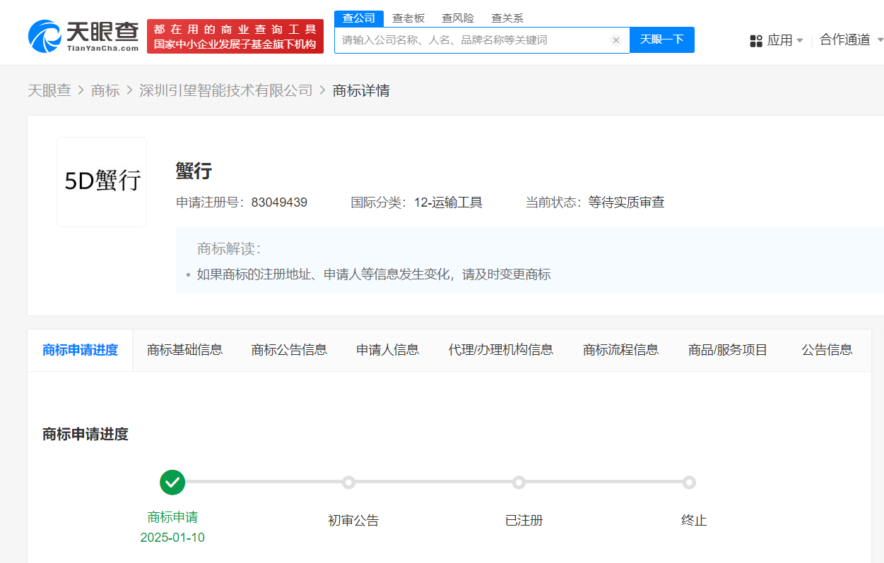 天眼查知识产权信息显示,近日,深圳引望智能技术有限公司申请注册“5D蟹行”“华尔兹掉头”商标,国际分类为运输工具、网站服务、通讯服务等,当前商标状态均为等待实质审查。