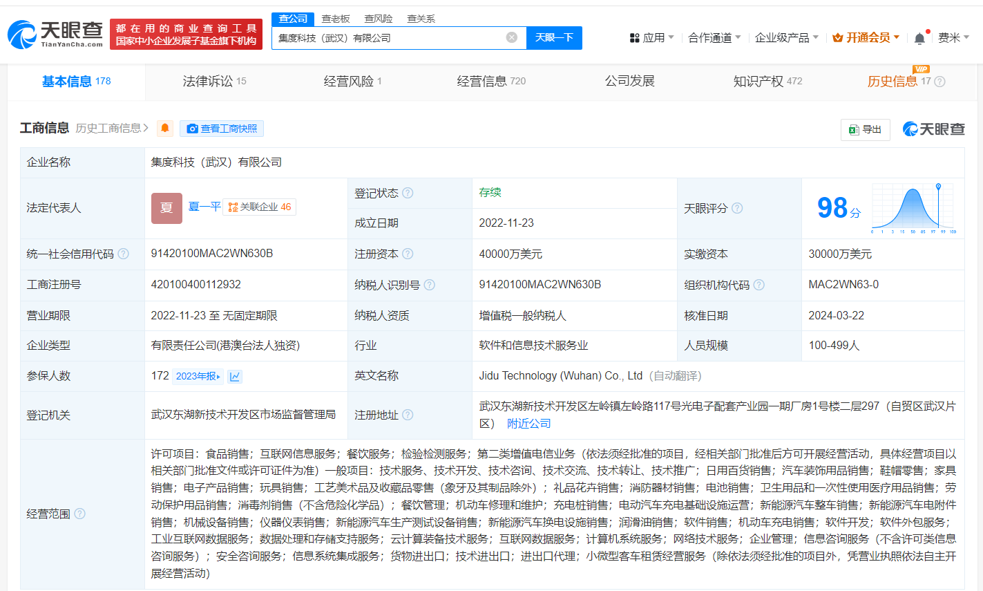 集度科技(武汉)有限公司成立于2022年11月,法定代表人为夏一平,注册资本4亿美元,经营范围含食品销售、互联网信息服务、电动汽车充电基础设施运营、新能源汽车整车销售、新能源汽车电附件销售、日用百货销售等,由集度汽车(香港)有限公司全资持股。