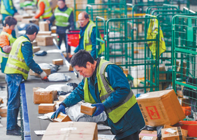 湖南道县,中国邮政工作人员分拣快递包裹。