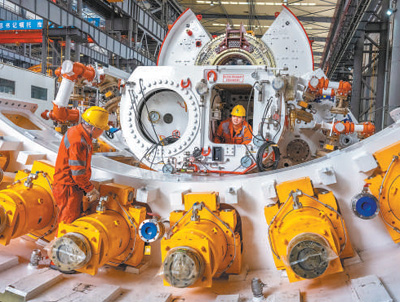 广东佛山市顺德区中铁华隧联合重型装备有限公司,工人们在调试盾构机。