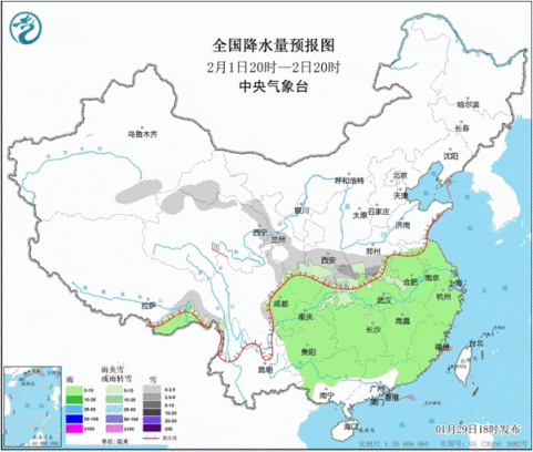 预计正月初二至初五(1月30日至2月2日),甘肃东部、陕西南部、华北南部、黄淮南部、江汉北部等地有小到中雪或雨夹雪,陕西南部、湖北西北部、河南西部、甘肃东南部等地部分地区有大雪,局地暴雪。南方大部地区有小到中雨,局地大雨。