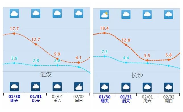 不过,这样的偏暖并不牢靠,在冷空气叠加阴雨影响下,从大年初三开始,南方多地气温又将从前期明显偏高转为偏低。像武汉,明天最高气温将近18℃,大年初五降至4℃,降温幅度达14℃;长沙明天最高气温18℃,大年初四、初五或降至5至6℃,体感明显由暖转冷。