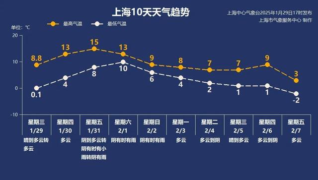 据“上海天气发布”微信公众号消息,大年初一(1月29日),上海晴冷开场。受辐射降温影响,早晨气温较低,市区最低气温0.1℃,郊区在零下7℃到零下2℃之间,崇明最冷,为零下6.6℃。白天阳光在线,气温回升比较快。全市最高气温普遍来到7~10℃。风力不大,空气比较干燥。