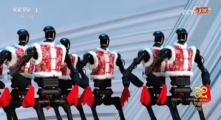 节目中,穿上红色大花袄的机器人会变换队形、舞动身体,还会多角度转手绢。