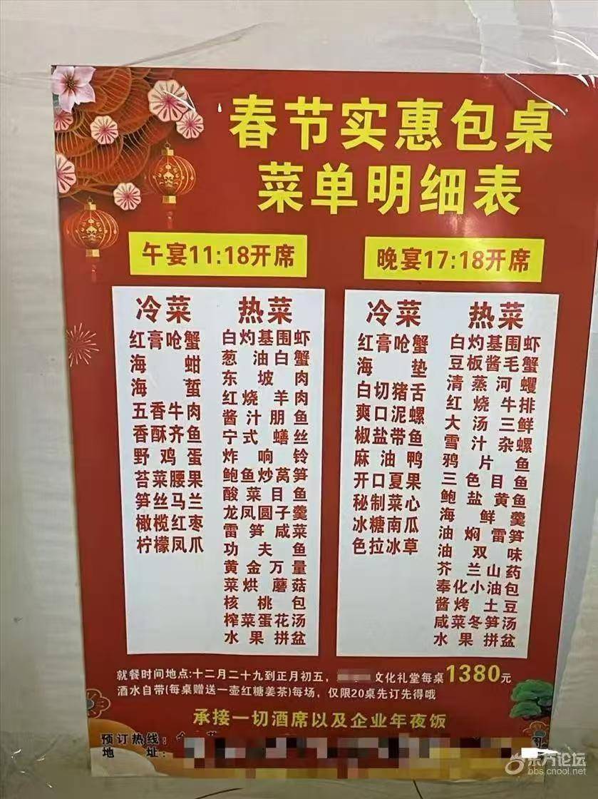 九派新闻注意到,上述年夜饭菜单并不只此一例。在宁波市奉化区桑园村文化礼堂的春节年夜饭套餐中,冷菜及热菜共30道,每桌1600元,用餐时间同样分为午宴和晚宴,具体菜式包括肉末鳗膏羹、豆板毛蟹、宁波老三鲜、酒酿小丸子、广式烧鹅、冬笋咸菜汤等。