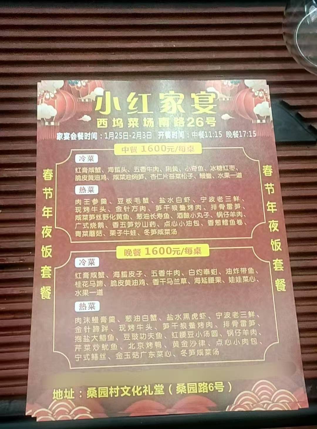 1月28日,在桑园村文化礼堂承办年夜饭的饭店老板表示,这是村里第一年像这样承办年夜饭,年夜饭套餐的菜式以海鲜为主,从开餐前一晚开始准备,食材也都在当晚采购。根据目前预订情况,除夕当天将有十多桌村民到礼堂用餐。