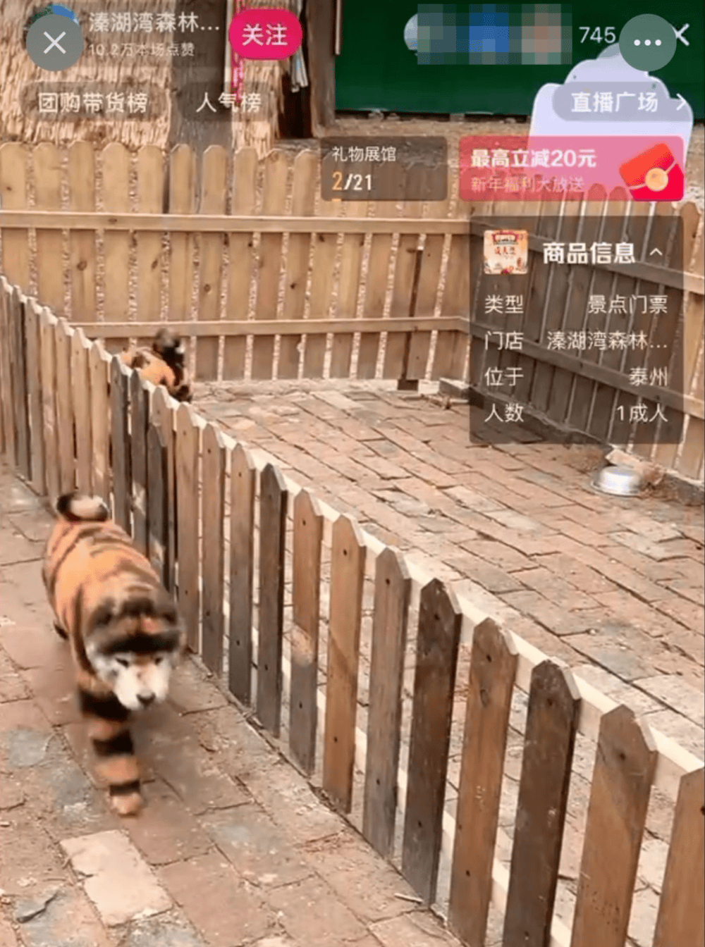 “想听虎啸的扣波1!咱们老虎非常大、非常凶猛!”配合着这样的解说词,溱湖湾森林动物王国1月24日的抖音直播画面里,却是两只被染成“老虎”的松狮犬在围栏里跑来跑去。有观众留言表示疑惑:“这是老虎?”“这么染色是不是对动物不好?”