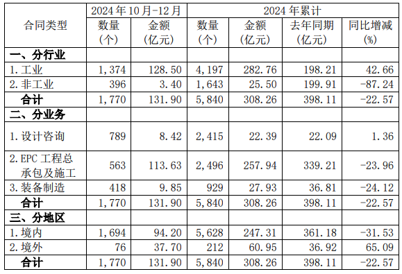 1月27日,中铝国际发布公告,2024年公司新签合同总额为308.26亿元,同比减少22.57%。其中,2024年公司新签工业合同为282.76亿元,占公司新签合同总额的91.73%,较上年同期工业项目增加42.66%。公司全年新签海外合同60.95亿元,较上年同期增加65.09%。