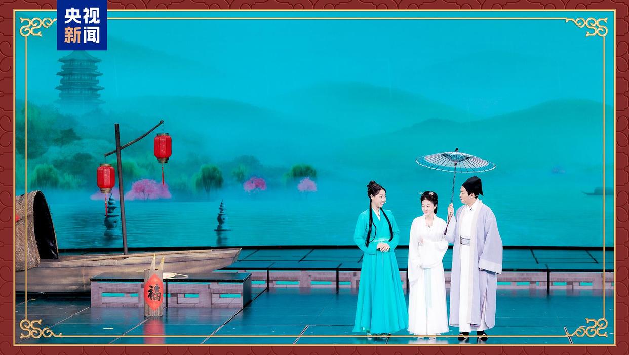 小品《借伞》围绕《白蛇传》中“断桥借伞”的经典桥段,巧妙串联京剧、粤剧、川剧、越剧四个剧种,在一连串不期而遇的“误会”中拉满喜剧效果,也为观众送上“天下有情人终成眷属”的美好祝福。