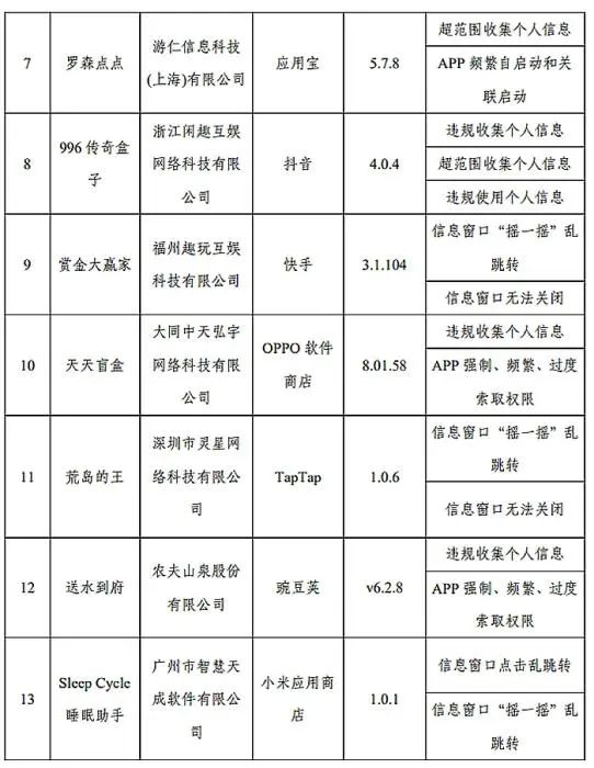 工信部最新公布的侵害用户权益行为的部分App(SDK)。