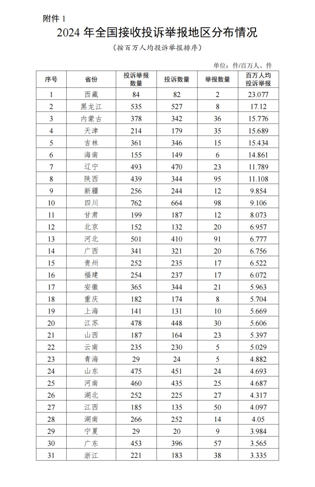 各省(自治区、直辖市)按照接收投诉举报数量排序,四川、黑龙江、河北、辽宁、江苏、山东、河南、广东、陕西、内蒙古排在全国前10位;按照百万人均投诉举报数量排序,西藏、黑龙江、内蒙古、天津、吉林、海南、辽宁、陕西、新疆、四川排在全国前10位。
