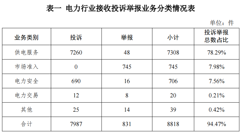 电力行业排在首位,数量为8818件、占投诉举报总数的94.47%,主要集中在供电服务、市场准入、电力安全等方面。