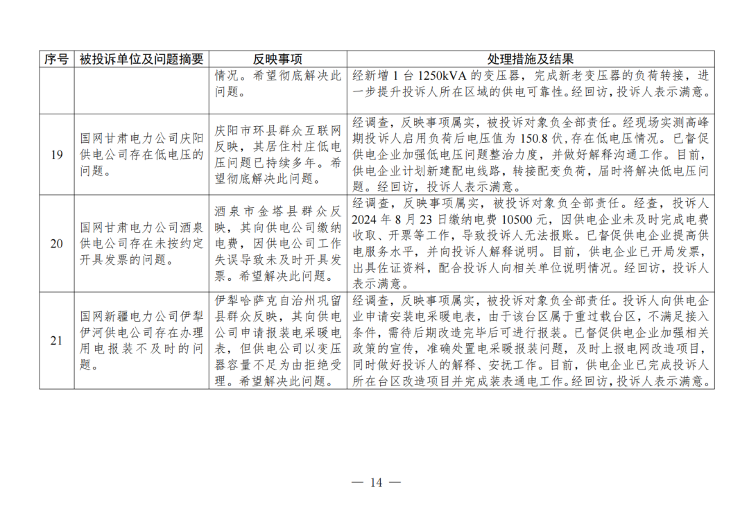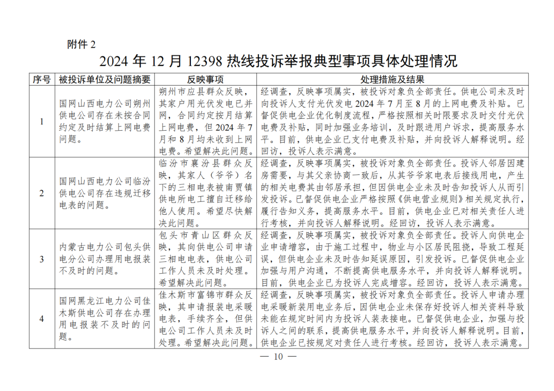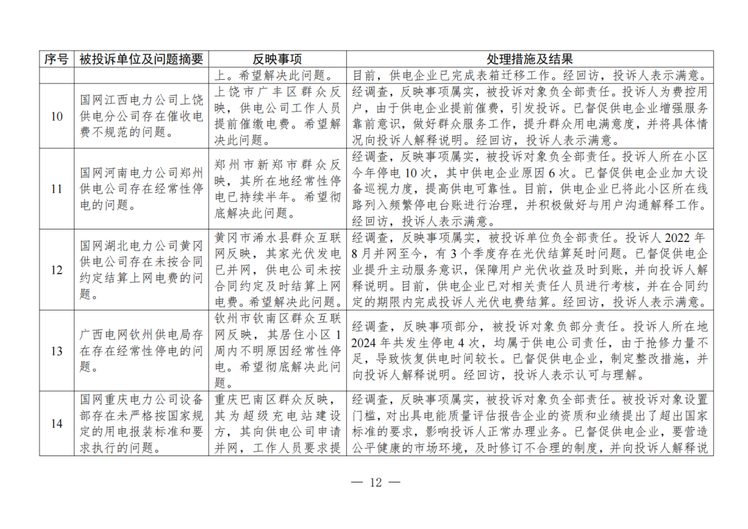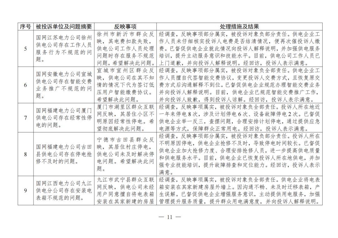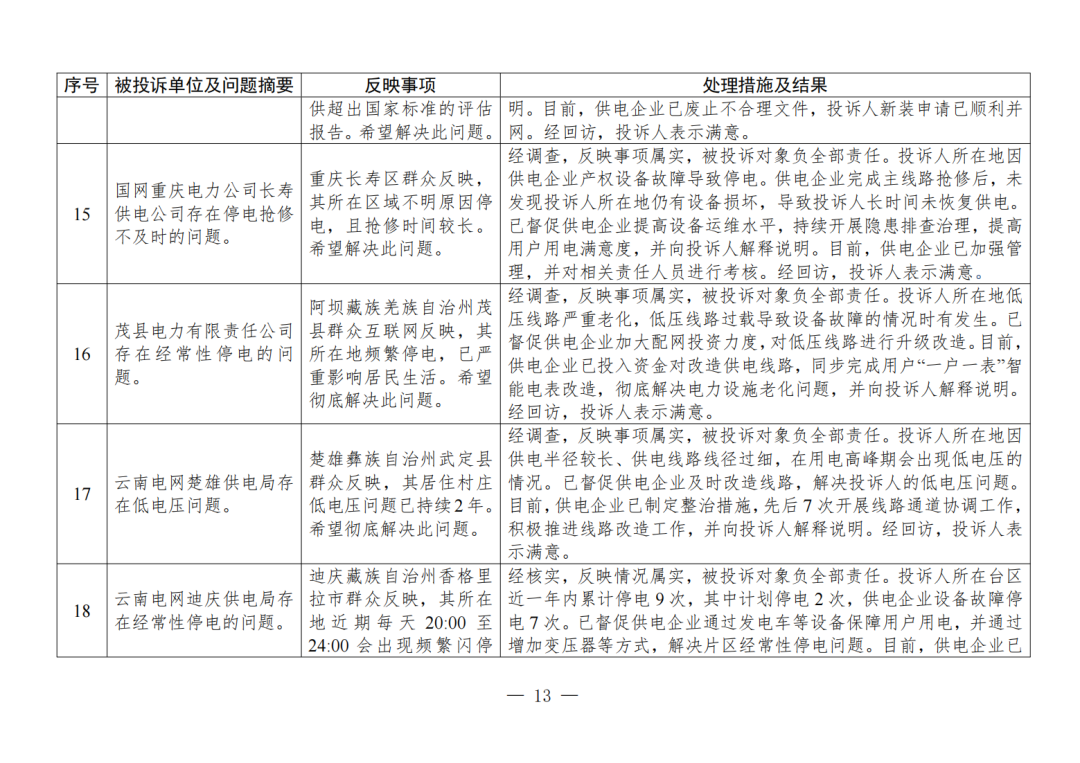 对于群众反映的投诉举报,国家能源局派出机构严格按照国家有关法规政策进行处理。一是督促供电企业加大投入改善网架结构,强化配网基础建设,缩短供电半径,提高电网转供、互供能力,有效解决故障停电、低电压等电能质量问题,进一步提升供电可靠性。二是要求供电企业加强设备巡视和运行维护,加大隐患排查、整治力度,增加抢修资源投入,提升停电抢修管理水平,切实缩短抢修复电时间,提高供电质量。三是加大监管力度,进一步规范用电报装管理,不断强化业扩报装全流程管控,及时完成装表接电。四是通过行政处罚、监管约谈、责令整改等方式,纠正有关企业违法违规行为,维护公平公正的市场秩序和群众合法权益。五是通过解释说明、澄清事实,消除群众误解。