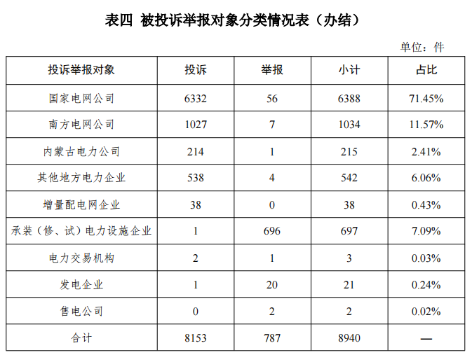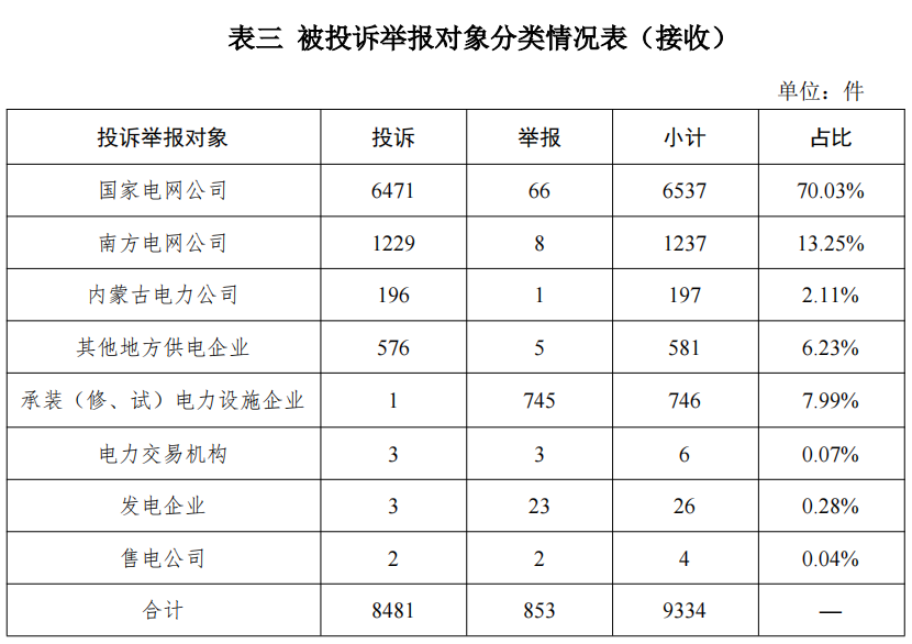 供电企业8552件、占投诉举报总数的91.62%,其中国家电网公司6537件、占投诉举报总数的70.03%,南方电网公司1237件、占投诉举报总数的13.25%,内蒙古电力公司197件、占投诉举报总数的2.11%,其他地方供电企业581件、占投诉举报总数的6.23%;承装(修、试)电力设施企业746件、占投诉举报总数的7.99%;电力交易机构65件、占投诉举报总数的0.07%;发电企业26件、占投诉举报总数的0.28%;售电企业4件、占投诉举报总数的0.04%。